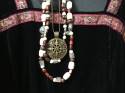 - 2 necklaces are beaded, third is a metal medallion on a faux leather cord